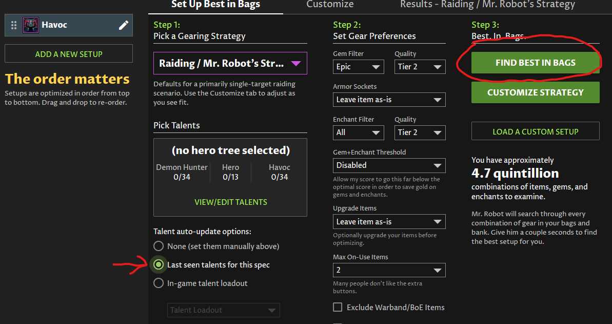 When you do that, it should automatically populate your talents now that you have the “Last seen talents for this spec” option enabled on your Havoc Best in Bags setup.