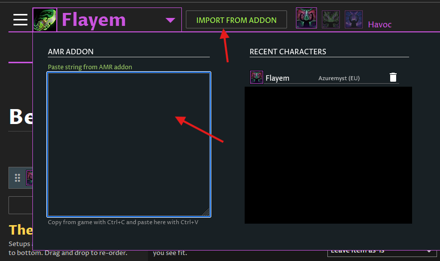 Then go in-game, and make sure that you have the talents active that you want to use. Then export from our in-game addon to the website using the export tab of the addon and pasting into the import from addon box on the site: