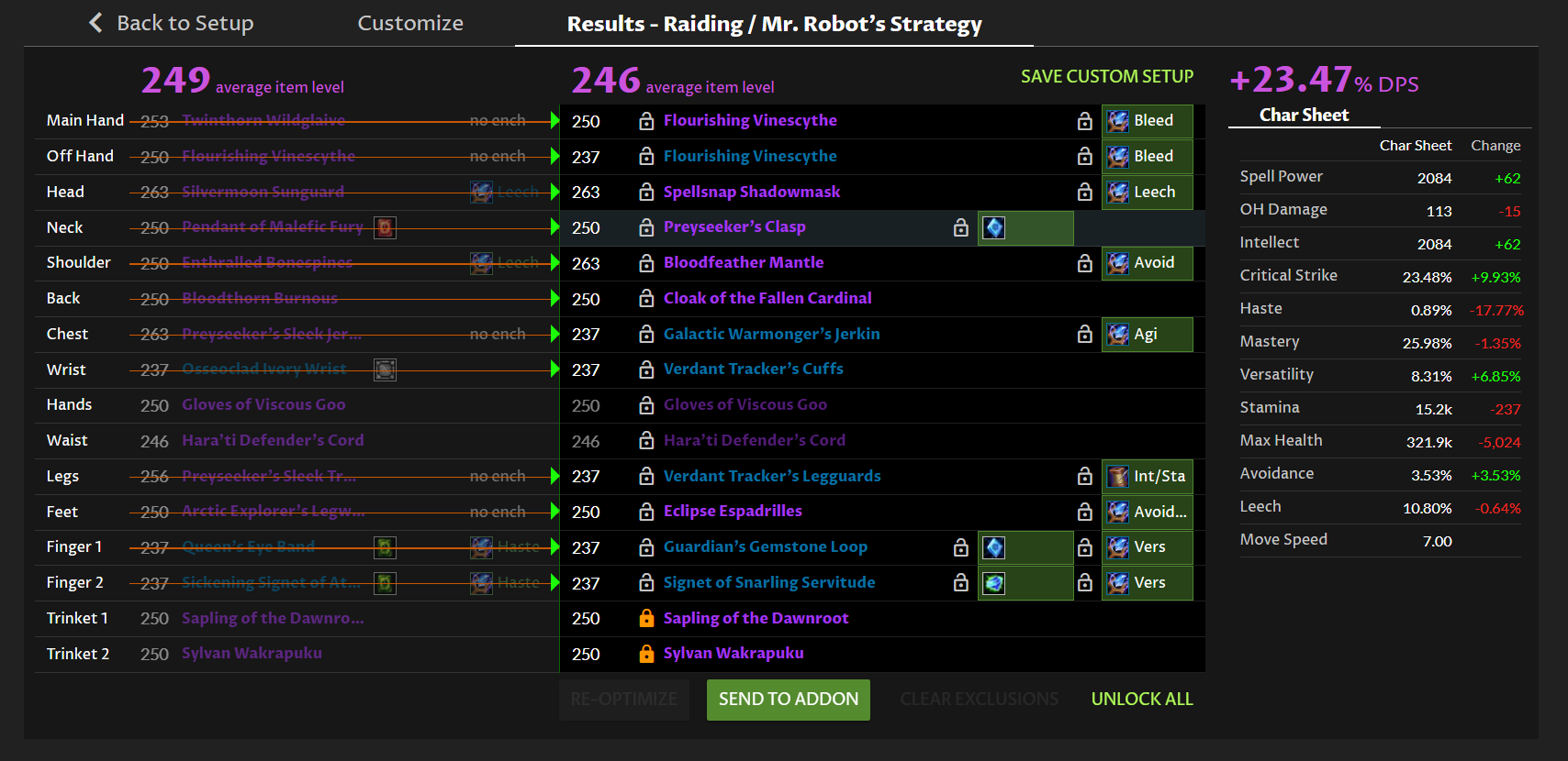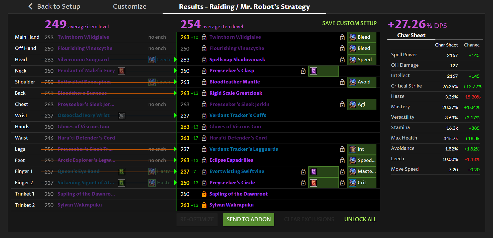 This will not change your optimization, for the reasons that I mentioned before. Haste scaling is not linear for devourers. Our optimizer is running real simulations to do the optimization, so it can fit your gear very well to actual simulation results. I did notice that Best in Slot will actually try to get less haste now with this updated implementation - presumably because the exponential drain increase results in a serious diminishing return on getting more haste.