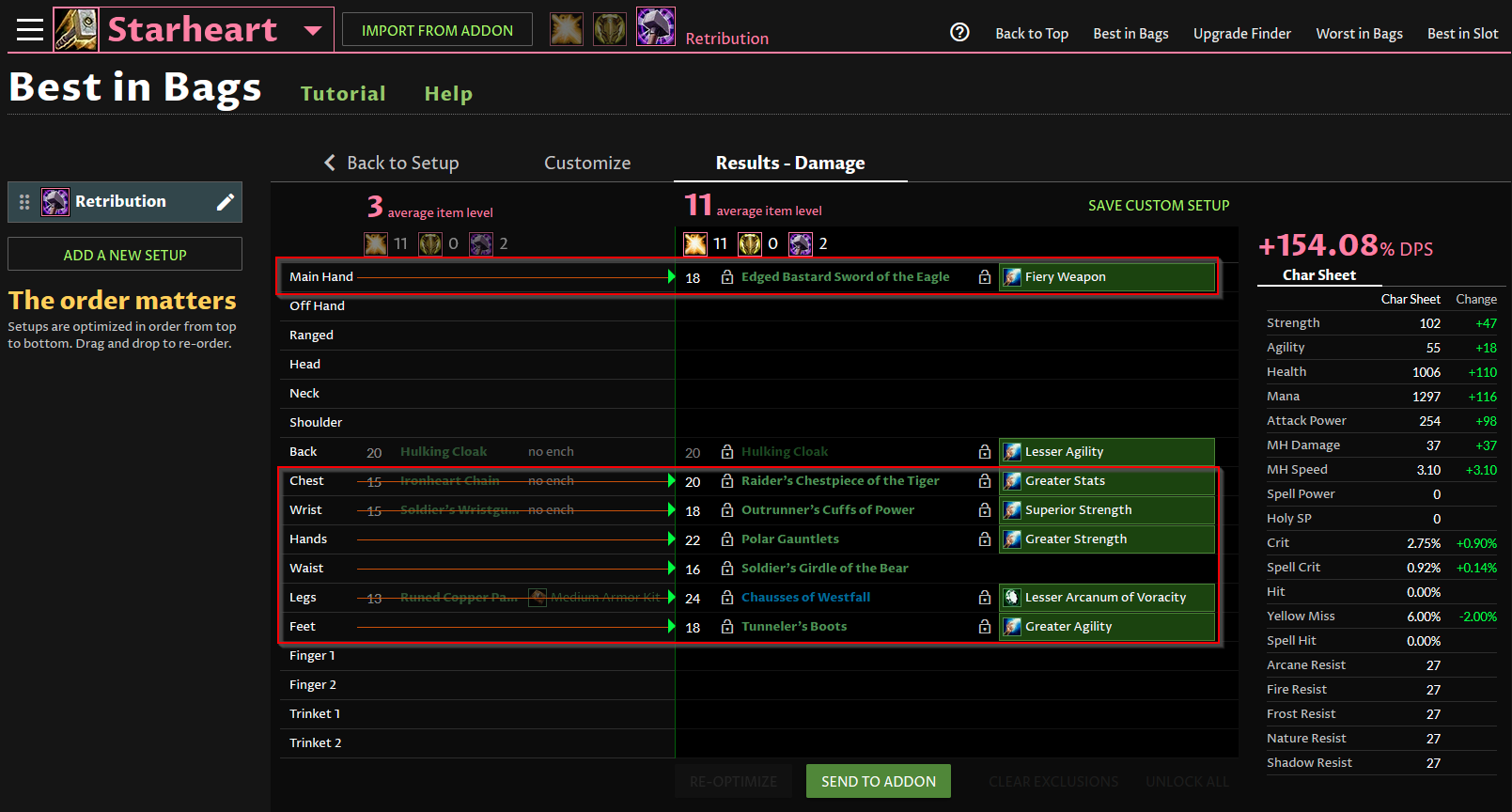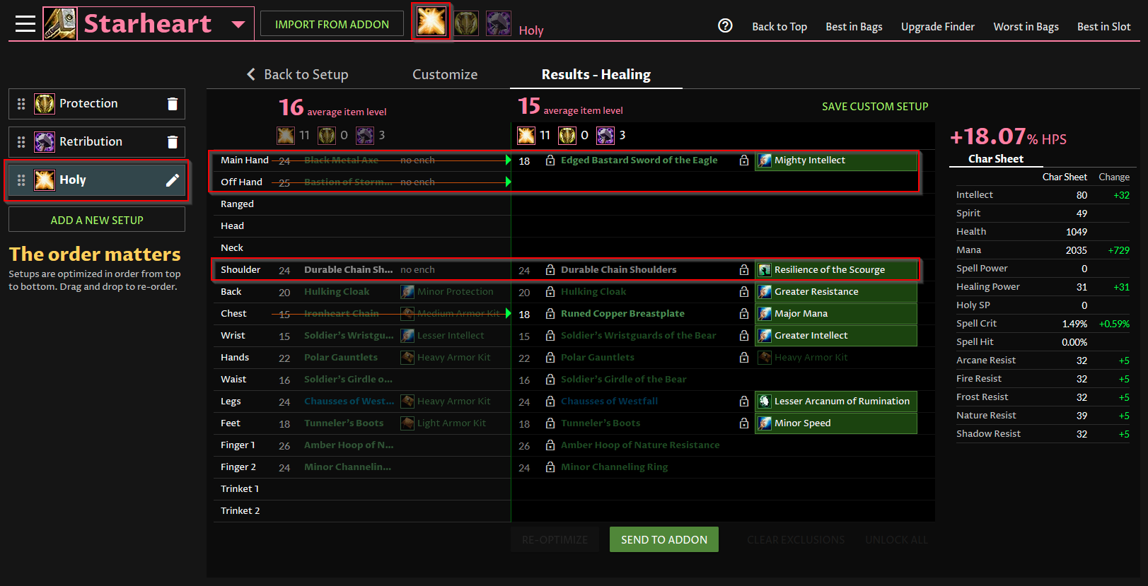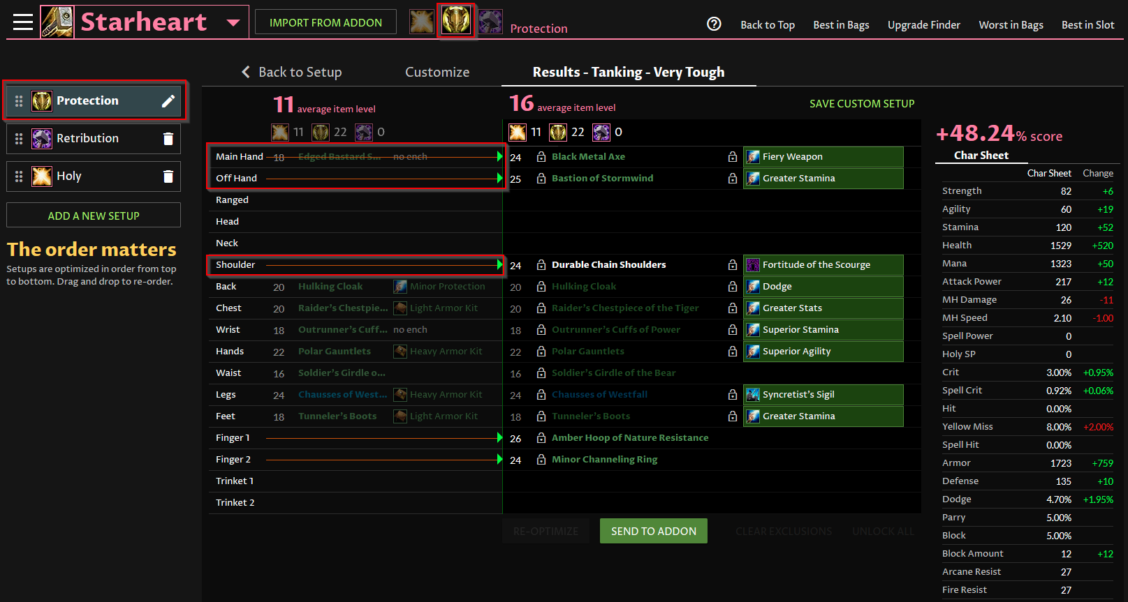 For example if you have mostly Protection talents chosen, we’ll detect that Protection is probably your spec in-game right now, and then we’ll update your last-equipped Protection gear on the website (which shows up on the left side of Best in Bags). We won’t touch what you see on the left side for Retribution or Holy – they will stay at the last thing we saw.