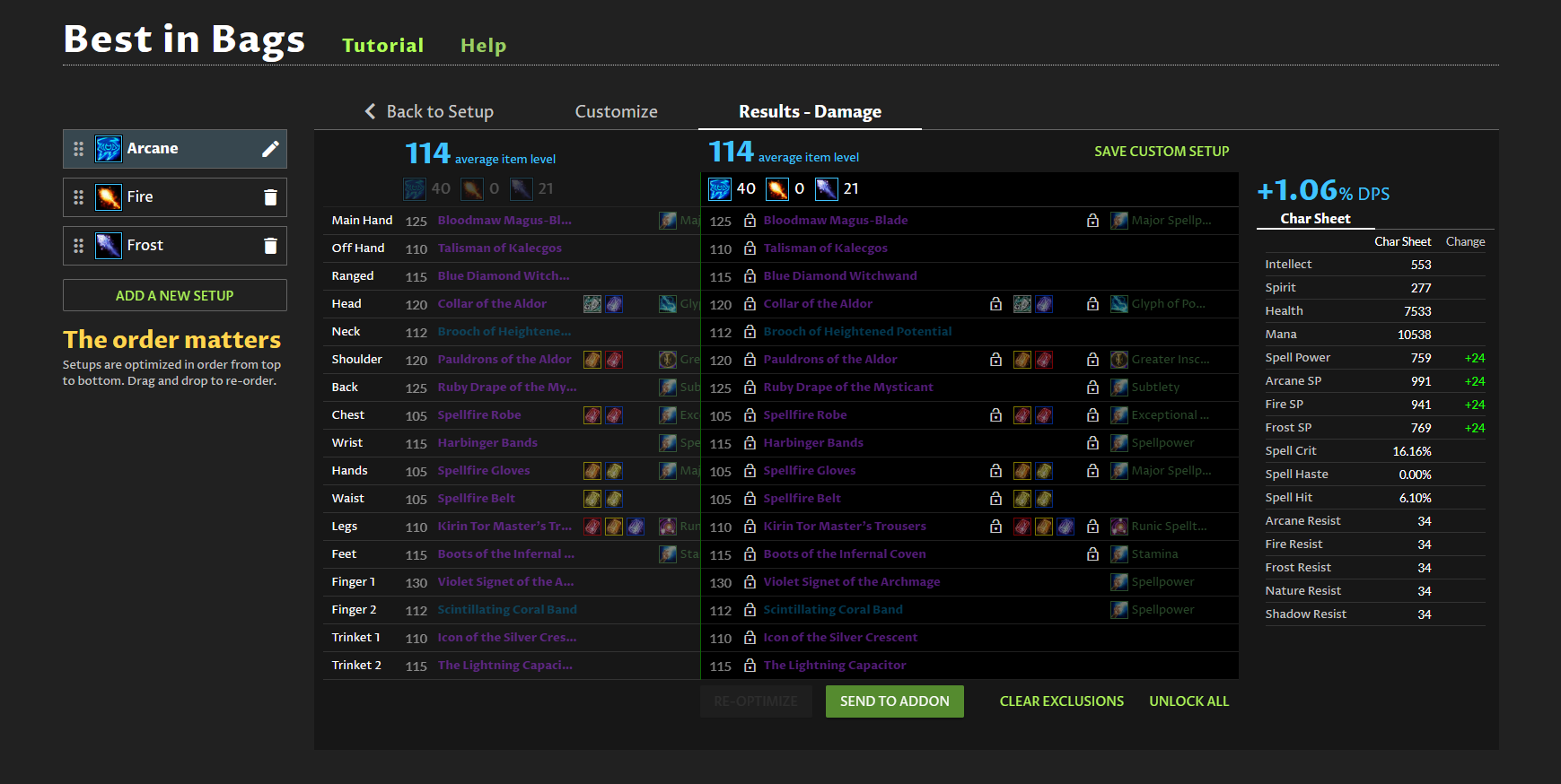 After importing a character that has ring enchants and using BiB, the left panel with the original items doesn’t show ring ehcnants. The middle panel shows enchants just fine, as if they weren’t added but already existed. The right panel shows +24 spell power for 2 “new” enchants and therefore +1% dps increase.