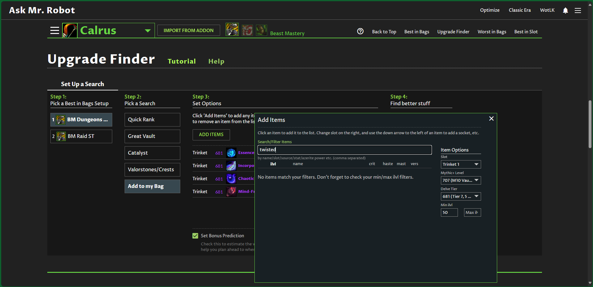 [Shadowguard’s Twisted Harvester] still missing from Upgrade Finder. Found from Zah’ran, the delve trinket vendor. The others he has on him when I got him are showing fine (screenshot attached) but nothing for this item.