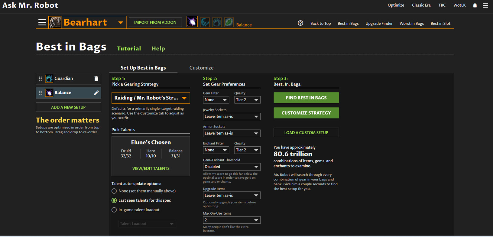 You can drag and drop your setups (right above where it says “The order matters” in big yellow text on the left) to change the priority and make Balance your top priority, or, you can set the gem and enchant filter to None on your Guardian setup as well.
