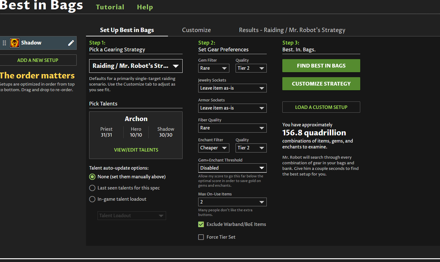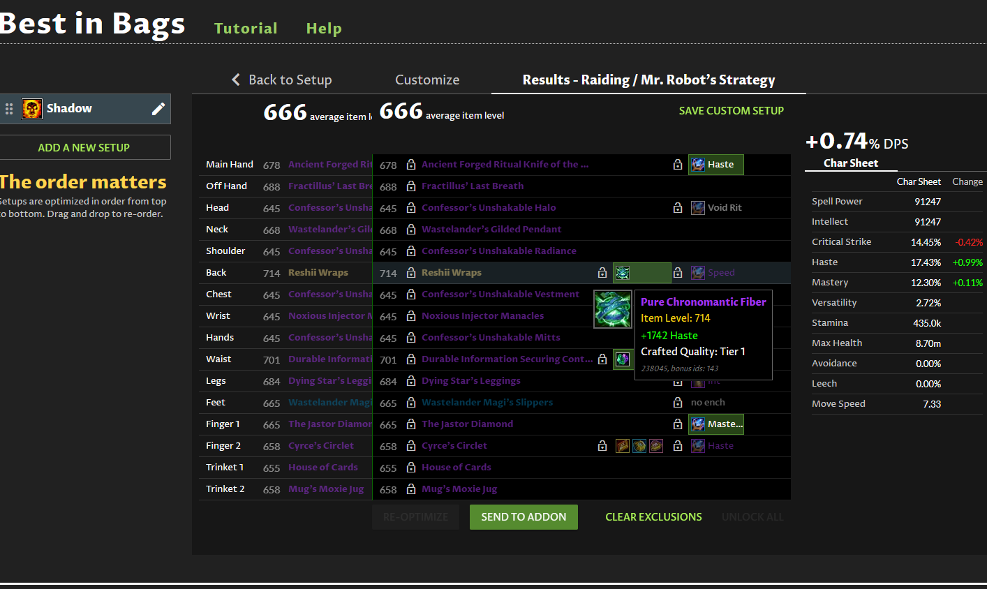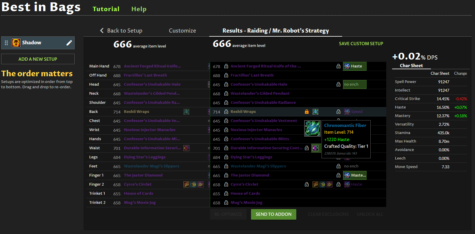 I have Rare selected for “Fiber Quality”, however every time I re-run BiB, it keeps recommending Epic, which shows a higher DPS increase. I tried locking it to Rare one, but it keeps resetting that too.