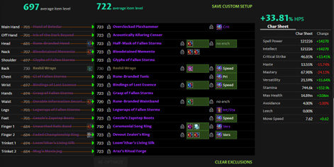 Now that we have some time between major patches, we have been working on some potential speed improvements to the optimizer. This is ultimately the way to improve on cases like this – simply try more options, particularly around more difficult cases with dependent items like crafted embellishments, set bonuses, etc.