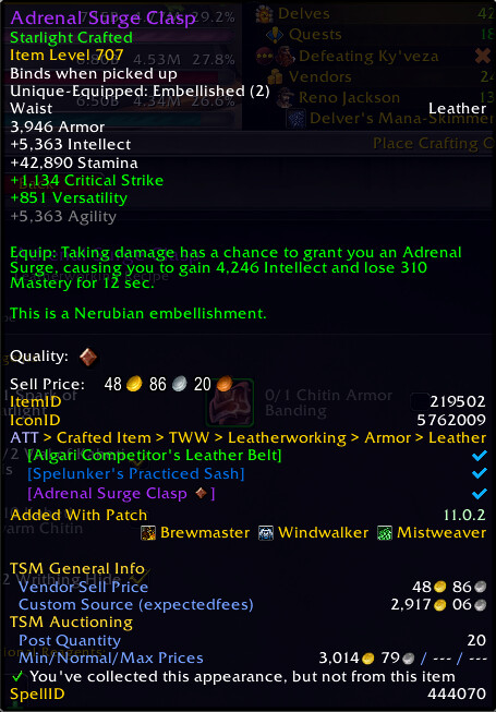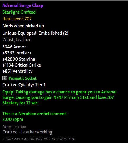 Our estimate for the adrenal surge clasp seems to match the game spell data… 2 rppm (with a 15 sec ICD), 12 sec buff… the primary stat amount and mastery penalty seem to match the game data as well – do the tooltip values on the website match what you are seeing in-game?