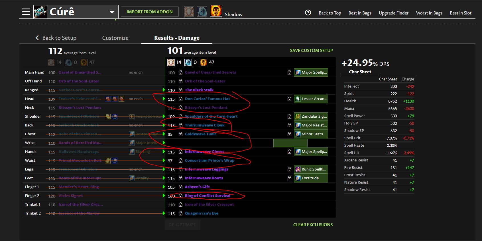 have this Output Today (and before also) - see Pic- on BIS Calulator - Specialy Back Slot, Rings, Waist, Finger where Sim is Selecting Resi , Stamina and other Weired Items.