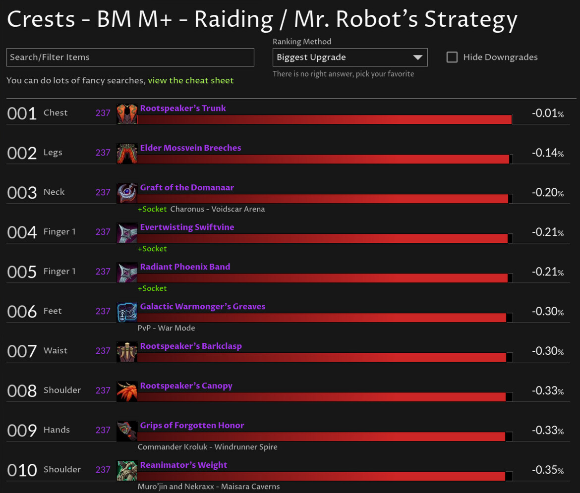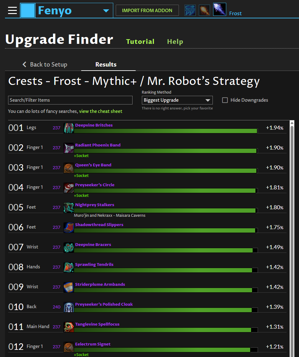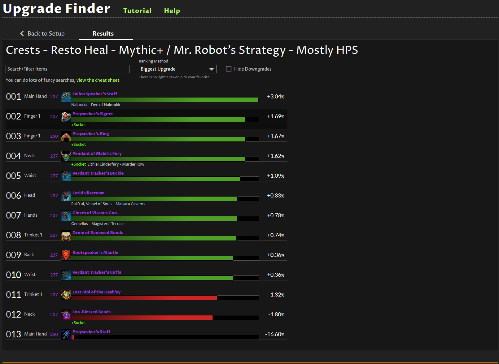 I used my resto spec and was using the crests upgrade finder. Here is a new Snapshot and a picture.