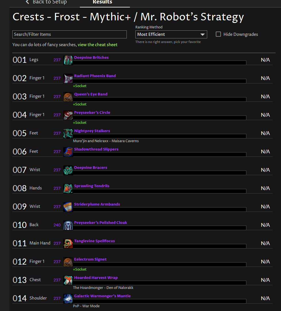 @nemo296 This is a different issue – the efficiency ranking will show N/A when you either have something better than that item already, or the upgrade would be free (cost no crests, we ignore the gold cost).