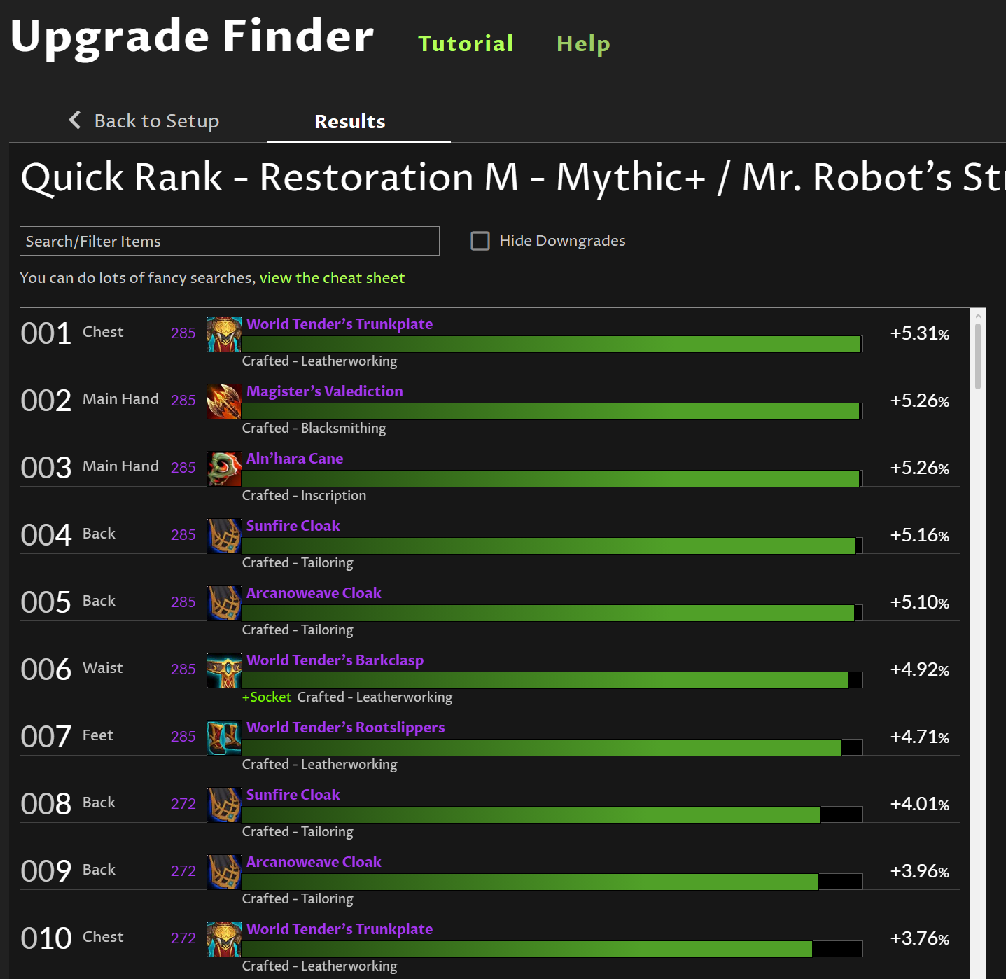 Despite turning crafted gear to None and trying to look for potential upgrades in Mythic dungeons I am still getting all crafted gear in the upgrade finder, it worked fine until today.