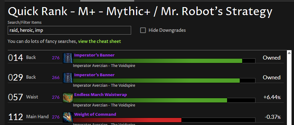 I have a fully crafted waist, yet AMR tells me that in Upgrade Finder, Quick Rank for “raid, heroic, imp“ so is “Endless March Waistwrap“ a +6,44% increase. No-one needed it so I grabbed it, and when I try AMR again so is it not needed (new snap: 6d3c43c0a2984008b7aefe2a3b7e933e).