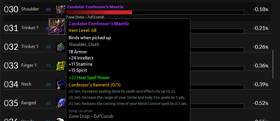 Similarly Jin’do’s Hexxer changes from +4.13% when searching upgrades in all raids, to 1.61% when searching only ZG upgrades.